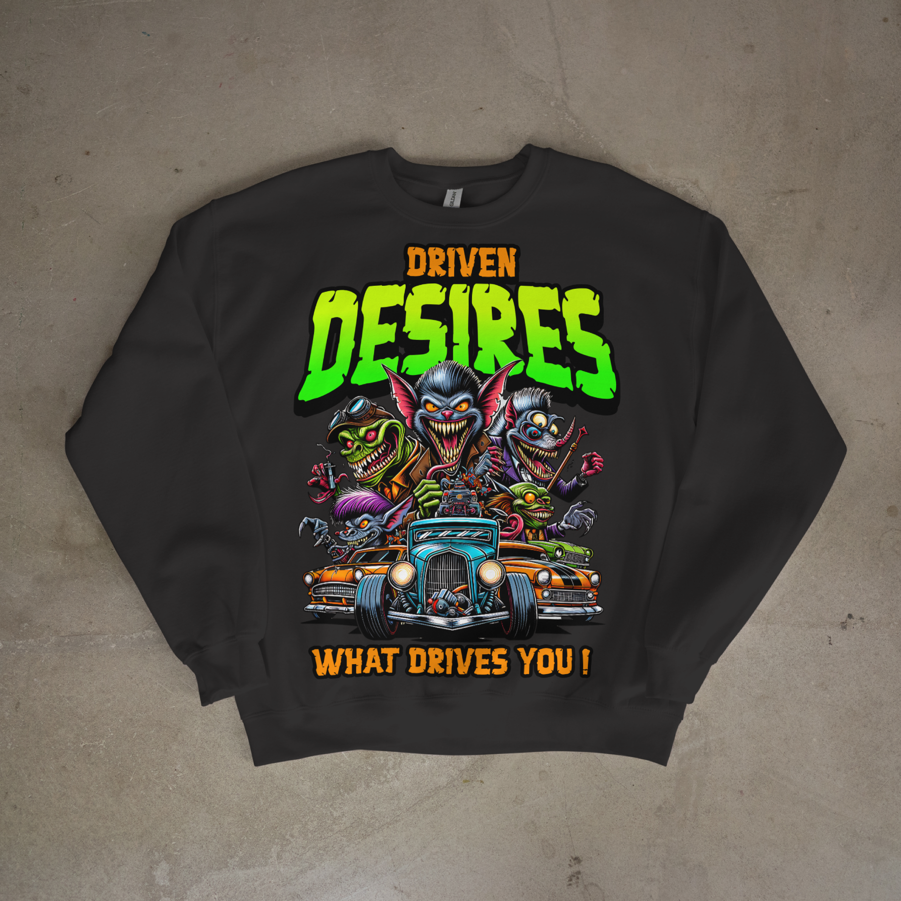 Bold, loud, and unapologetic. The Monstrous Mayhem crewneck features high-energy artwork, neon DESIRES lettering, and the statement “What Drives You?” Built for those who move different and chase what fuels them.
